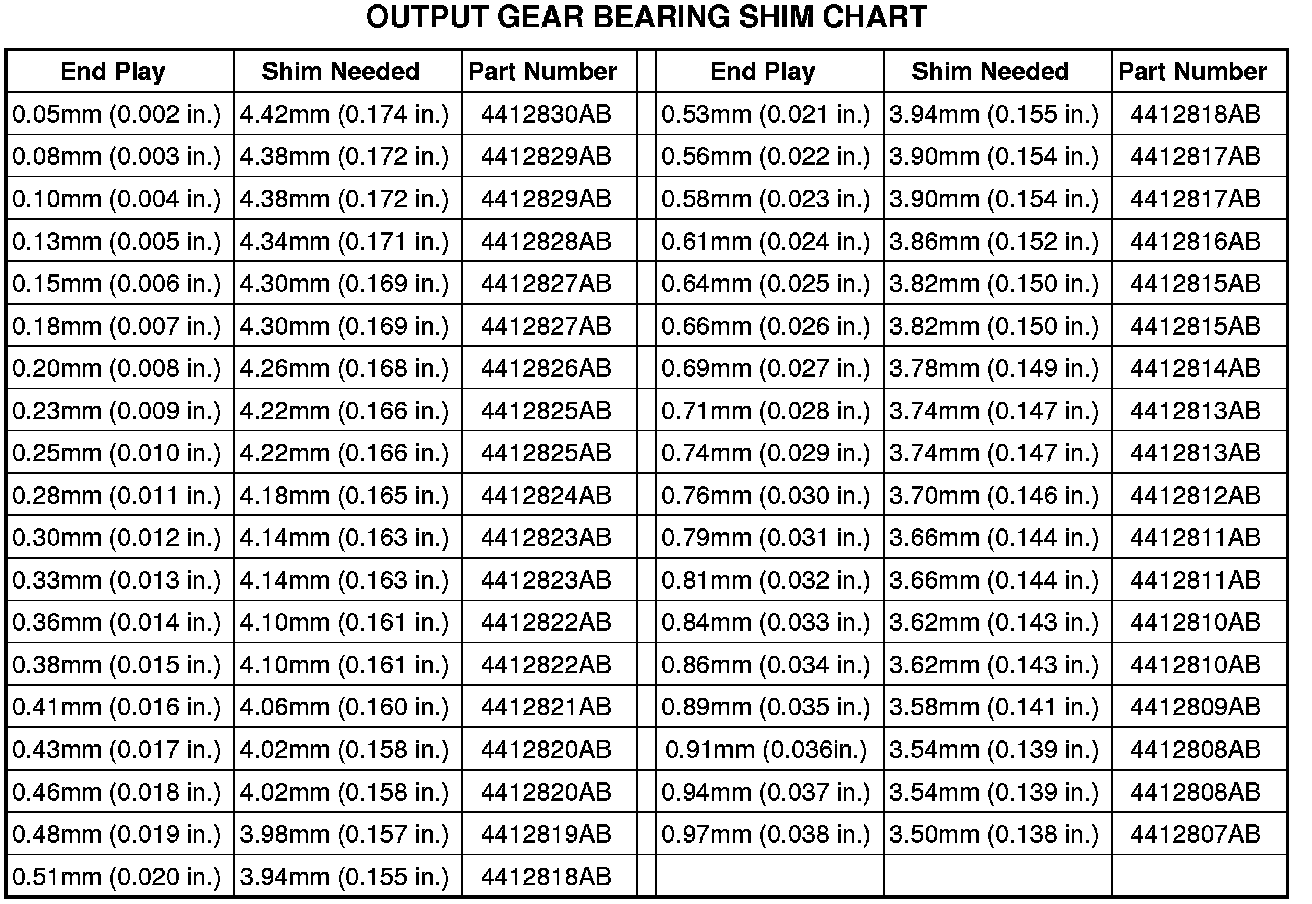 d. Refer to the output gear bearing shim chart for the required shim to obtain proper bearing setting.