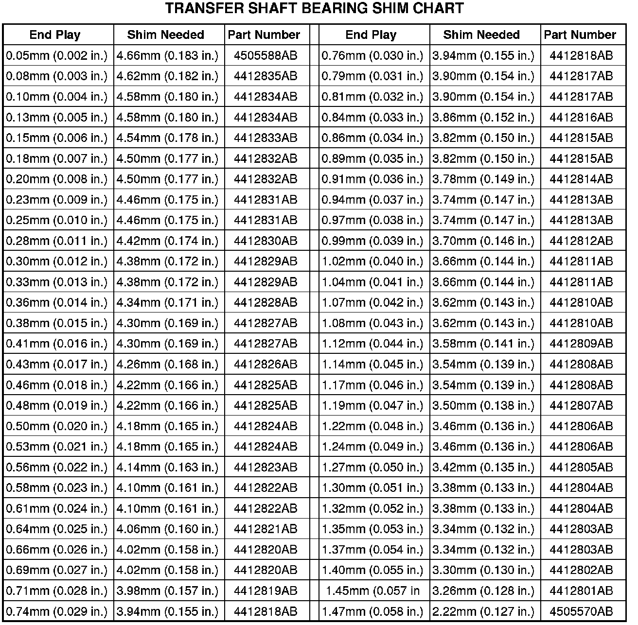 g. Refer to the transfer shaft bearing shim chart for the required shim combination to obtain the proper bearing setting.