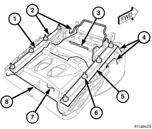8. Install the eight spacers (6) onto the mounting studs of the seat tracks (1 and 5).