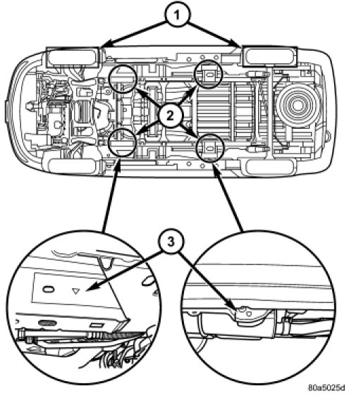 CAUTION: Do not position hoisting device on any suspension component, including the front suspension crossmember, the rear leaf springs, and the rear axle. Do not hoist on the front and rear bumpers, the lower liftgate crossmember, the lower radiator crossmember, the down standing flanges on the sill or the front engine mount.