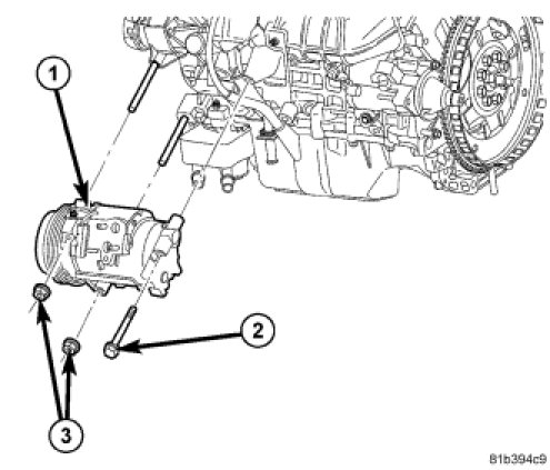 11. Install the nuts (2 and 4) that secure the A/C discharge and suction lines to the A/C compressor. Tighten the nuts to 23 Nm (17 ft. lbs.).
