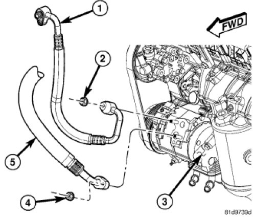 10. Install the A/C discharge line (1) and the A/C suction line (5) onto the A/C compressor (3).