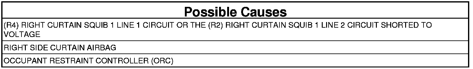 This DTC sets when the ORC detects a short to voltage on the squib circuit for more than 2.5 seconds. This DTC transitions from active to stored when the module sees a recovery from a short to voltage for greater than 2.5 seconds. When the ORC detects voltage on the Right Side Curtain Squib 1 circuits.