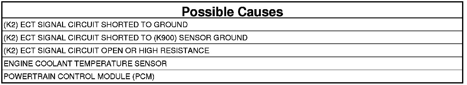 - Repair the (K2) ECT Signal circuit for a short to the (K900) Sensor Ground circuit.