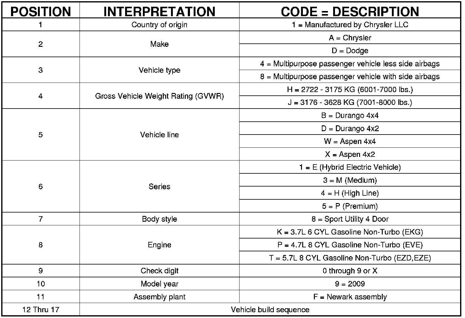 The Vehicle Identification Number (VIN) plate is attached to the top left side of the instrument panel. The VIN contains 17 characters that provide data concerning the vehicle. Refer to the decoding chart to determine the identification of a vehicle.