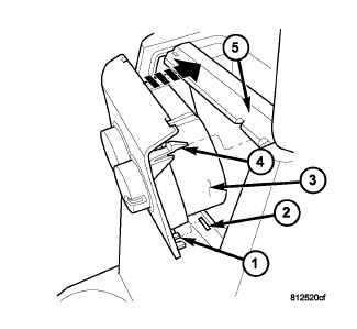 4. Rotate the rear A/C-heater control (3) forward far enough to align the two snap clips on the top of the rear A/C-heater control (4) with the receptacles in the top edge of the floor console opening (5).