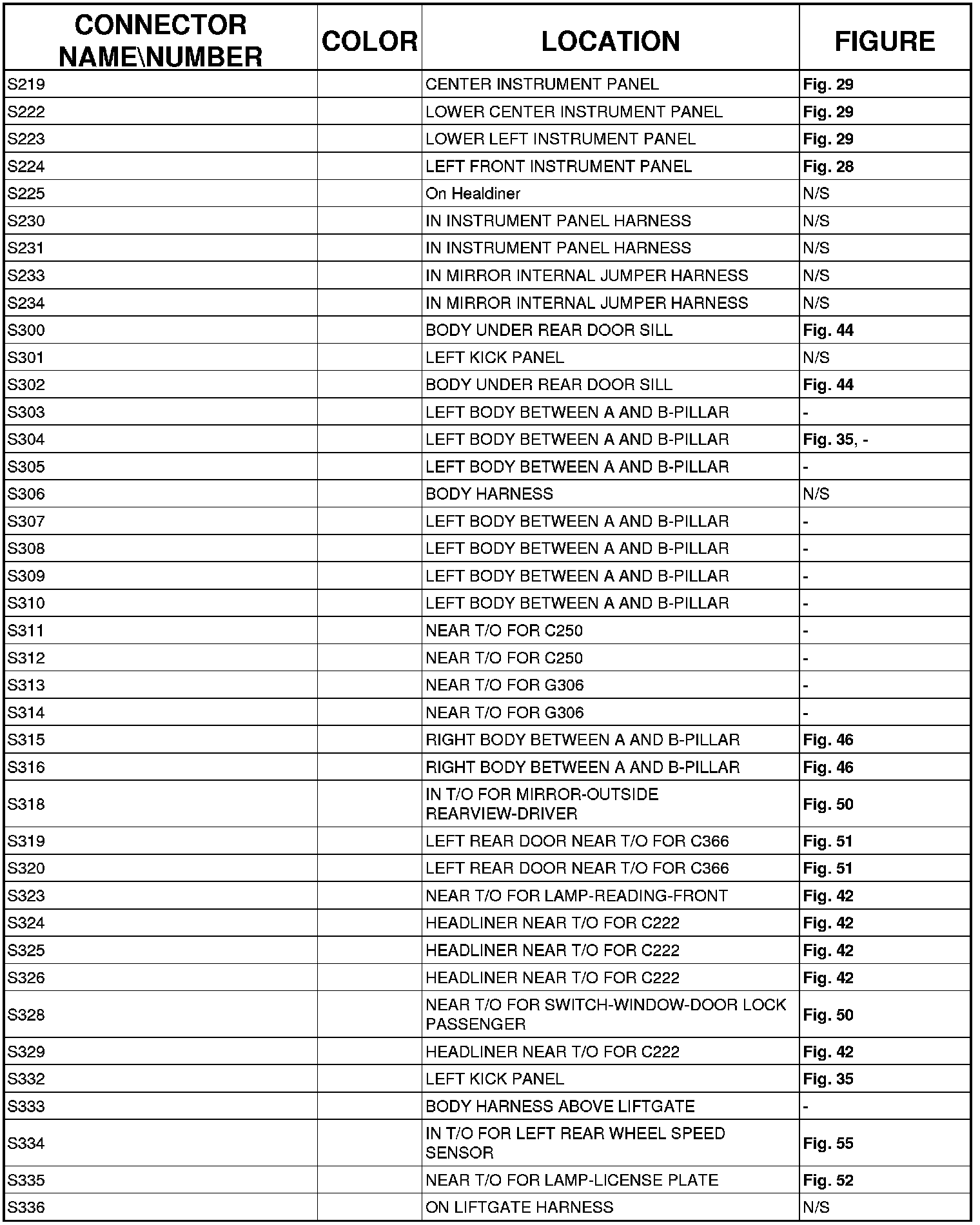 The abbreviation T/O (Take Out) is used in the location column to indicate a point in which the wiring harness branches out to a component.