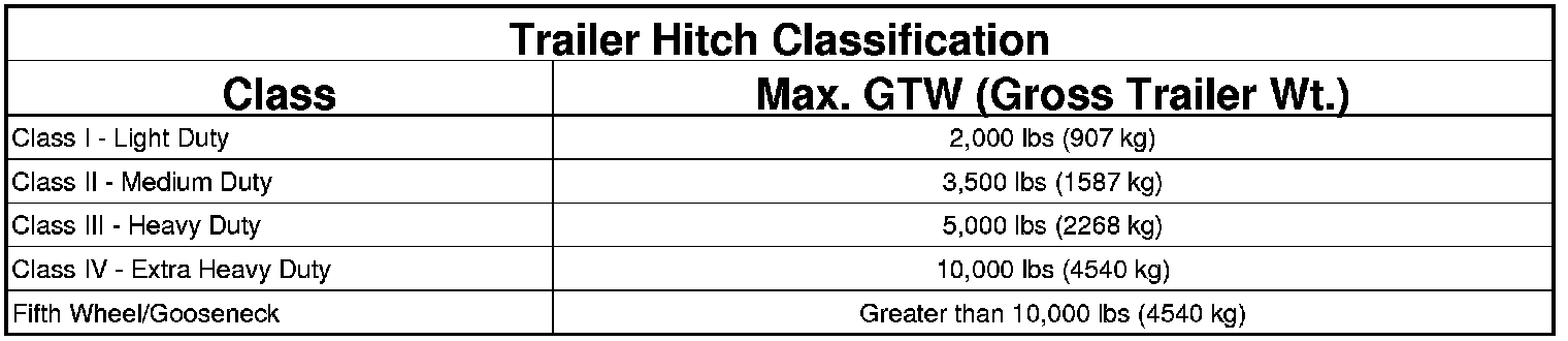 The following chart provides the industry standard for the maximum trailer weight a given trailer hitch class can tow and should be used to assist you in selecting the correct trailer hitch for the intended towing condition. Refer to Trailer Towing Weights (Maximum Trailer Weight Ratings) for the website address that contains the necessary information for the specific drivetrain.