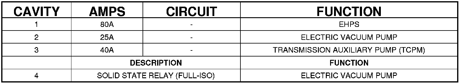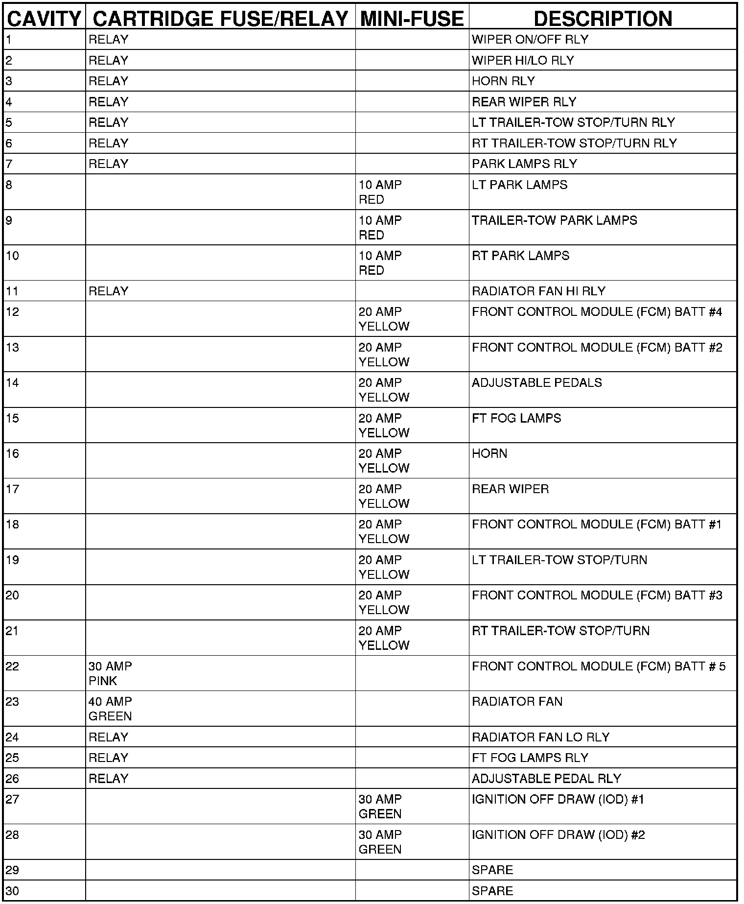 An Integrated Power Module (IPM) is located in the left side of the engine compartment. This center contains cartridge fuses, mini fuses and relays. A description of each fuse and component may be stamped on the inside cover, otherwise the cavity number of each fuse is stamped on the inside cover that corresponds to the following chart.