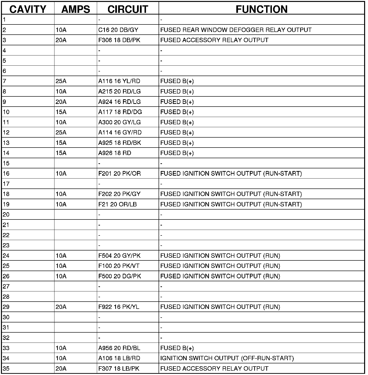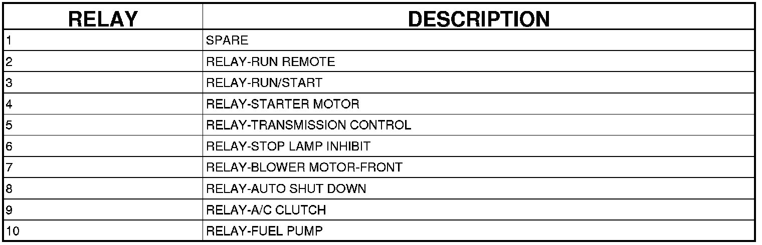 This center contains cartridge fuses, mini fuses and relays. A description of each fuse and component may be stamped on the inside cover, otherwise the cavity number of each fuse is stamped on the inside cover that corresponds to the following chart. These fuses and relays can be obtained from your authorized dealer.