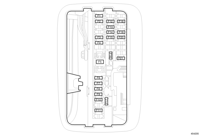 The fuse block contains blade-type mini-fuses, relays, and circuit breakers for high-current circuits. It is located in the left kick panel. It is accessible through a snap-in cover.