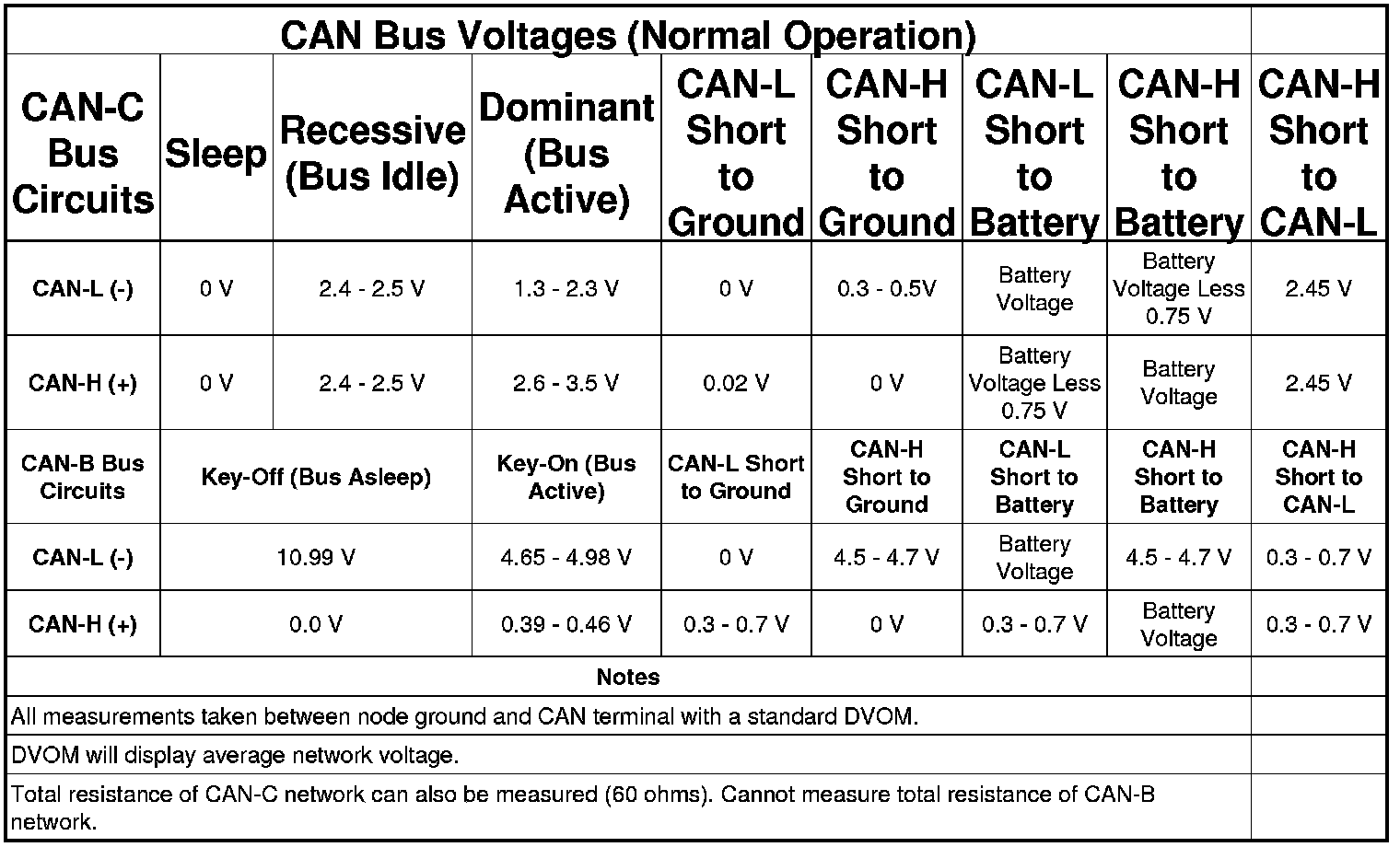 The CAN, H-LAN and D-PT bus nodes are connected in parallel to the two-wire bus using a twisted pair. These wires are wrapped around each other to provide shielding from unwanted electromagnetic induction, thus preventing interference with the relatively low voltage signals being carried through them. The twisted pairs have between 33 and 50 twists per meter (yard). While the CAN bus is operating (active), one of the bus wires carries a higher voltage and is referred to as the CAN High or CAN bus (+) wire, while the other bus wire carries a lower voltage and is referred to as the CAN Low or CAN bus (-) wire. Refer to the CAN Bus Voltages table.