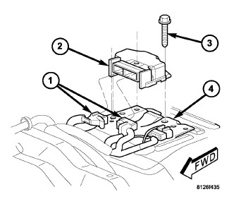 1. Carefully position the Occupant Restraint Controller (ORC) (2) to the ORC bracket (4) on the floor panel transmission tunnel. When the ORC is correctly positioned, the arrow on the ORC label will be pointed forward in the vehicle and the locating pin on the bottom of the right ORC mounting flange will be engaged into the locating hole in the ORC bracket.