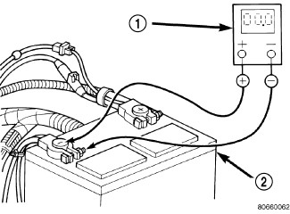 2. Connect the positive lead of the voltmeter (1) to the battery positive terminal post. Connect the negative lead of the voltmeter to the battery positive cable terminal clamp. Rotate and hold the ignition switch in the Start position. Observe the voltmeter. If voltage is detected, correct the poor connection between the battery positive cable terminal clamp and the battery positive terminal post.