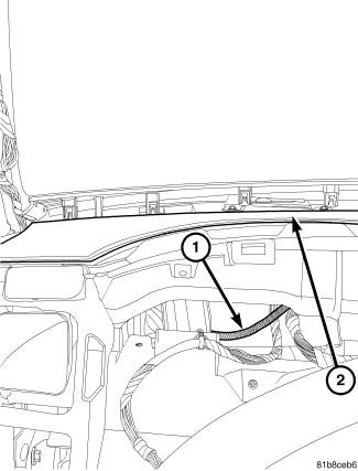 1. Fish coax cable (1) through openings on top of instrument panel. Position module (2) to top of instrument panel.