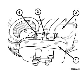 5. Install the heater core tube retaining bracket (4) to the top of the HVAC housing (2).