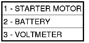 3. Connect voltmeter (2) to measure between positive terminal post on battery (1) and the battery terminal stud on the starter solenoid (3). Rotate and hold ignition switch in Start position. Observe voltmeter. If reading is above 0.2 volt, clean and tighten battery cable connection at solenoid and repeat test. If reading is still above 0.2 volt, replace the positive battery cable.