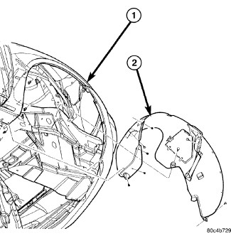 2. Install the screws that secure the front wheelhouse splash shield to the front fender (1).