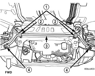 13. Remove the bolt mounting the engine torque strut to the right forward corner of the front suspension crossmember (3).