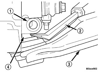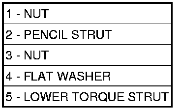 10. Remove the pencil strut (2) from the right front corner of the crossmember and body of the vehicle. Remove the washer (4) behind the strut from the torque strut bolt.