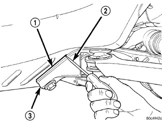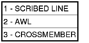14. Using an awl, (2) scribe a line (1) marking the location of the front suspension crossmember (3) where it is mounted against the body of the vehicle.