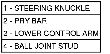 6. Separate each ball joint stud (4) from the steering knuckle (1) by prying down on lower control arm (3) and up against the ball joint boss on the steering knuckle (1).