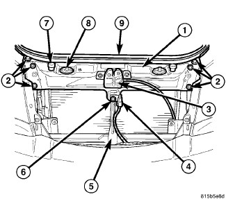 2. Install the six bolts (2) that secure the upper radiator support to the fenders. Tighten the bolts securely.