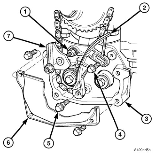 4. Remove chain cover (6) , guide (7) and tensioner (2). Discard pivot screw (5) and adjuster screw (4).