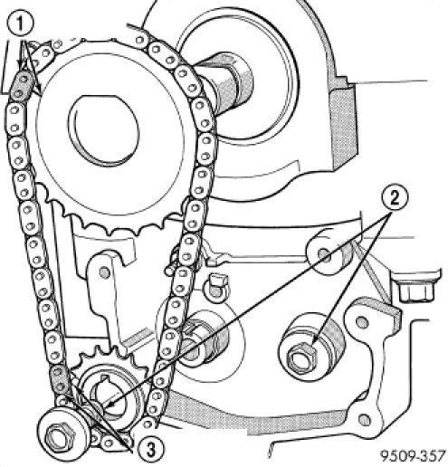 3. Remove chain cover (6), guide (7), and tensioner (2).