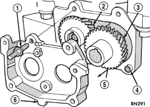The following components will remain intact during carrier removal: Gear cover (6), gears (5), balance shafts and the rear cover.