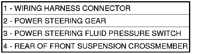 2. Connect the wiring harness connector (1) to the power steering fluid pressure switch (3). Be sure the locking tab on the wiring harness connector is securely latched following installation.