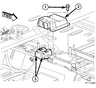 2. Position ORC (arrow pointing forward) in the console floor bracket, replace ground eyelet (1), and attach the screws (2) and tighten to 10.5 Nm (95 in. lbs.).