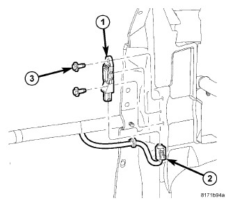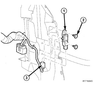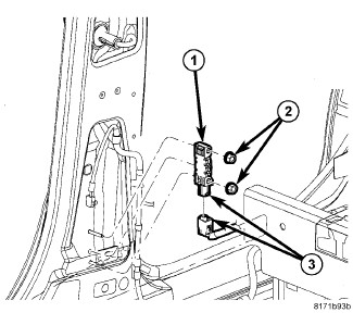 1. Position the Satellite Acceleration Sensor (SAS) (1) in B-pillar (electrical connector (3) facing down in vehicle) and install the retaining nuts (2). Tighten the nuts to 8 Nm (70 in. lbs.).