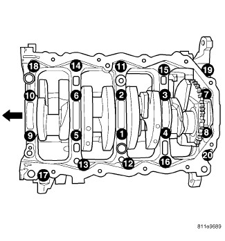 Install main bearing bed plate to engine block bolts (11-20), and torque each bolt to 28 Nm (250 in. lbs.) in sequence shown.