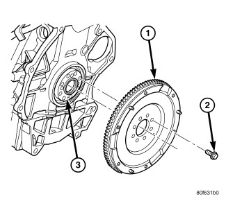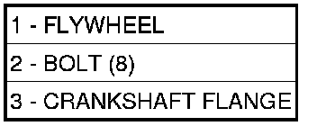 3. Remove eight (8) flywheel-to-crankshaft bolts (2)and remove flywheel assembly (1).