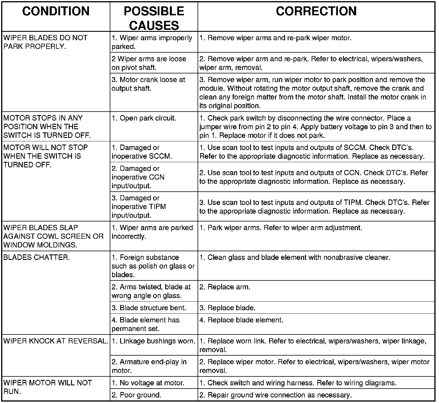 Whenever a wiper motor malfunction occurs, verify that the wire harness is properly connected, then start normal diagnosis and repair procedures. Refer to the FRONT WIPER MOTOR DIAGNOSIS table.