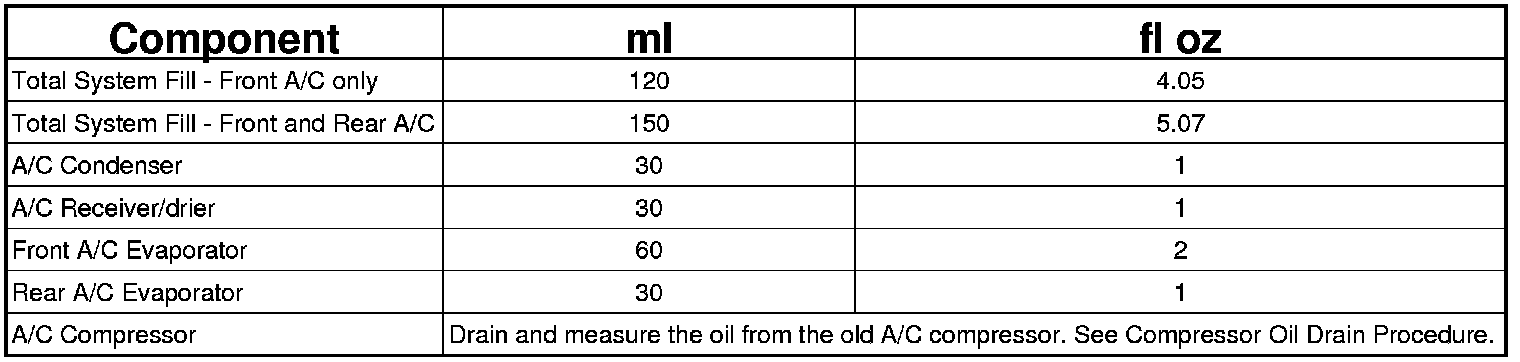 When an A/C system is assembled at the factory, all components except the A/C compressor are refrigerant oil free. After the refrigerant system has been charged and operated, the refrigerant oil in the A/C compressor is dispersed throughout the refrigerant system. The A/C receiver/drier, A/C evaporator, A/C condenser and the A/C compressor will each retain a significant amount of the needed refrigerant oil.