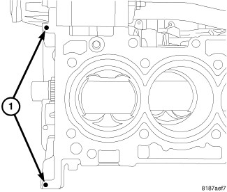3. Place two pea size dots of Mopar(R) engine sealant RTV or equivalent (1) on cylinder block as shown.