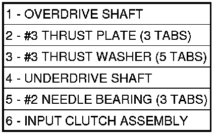 48. Install the #3 thrust plate (3) (note 3 tabs) to the bottom of the overdrive shaft assembly (1). Retain with petrolatum or transmission assembly gel (2).