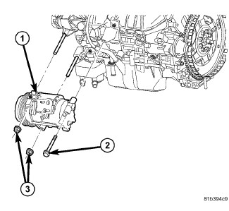 11. Install the nuts (2 and 4) that secure the A/C discharge and suction lines to the A/C compressor. Tighten the nuts to 23 Nm (17 ft. lbs.).