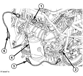 3. Install the O2S (5) to the catalytic converter (4). Tighten to 41 Nm (30 ft. lbs.).