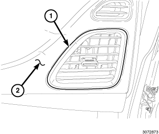 2. If servicing an outboard air outlet (1), position the outlet to the instrument panel cover (2) and engage the five metal retaining clips.