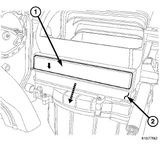 3. Remove the particulate air filter (1) from the HVAC housing (2) by pulling the filter element straight out of the housing.