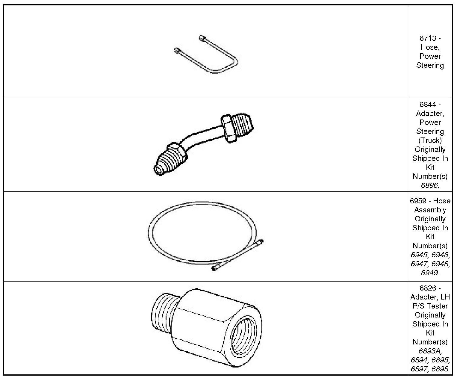 The following procedure is to be used to test the operation of the power steering system on this vehicle. This test will provide the flow rate (Gallons Per Minute (GPM)) of the power steering pump along with the maximum relief pressure. Perform this test any time a power steering system problem is present. This test will help determine if the power steering pump or power steering gear is not functioning properly. The test is performed using tools in the Power Steering Analyzer Kit with appropriate hoses and adapters. Tools and Equipment