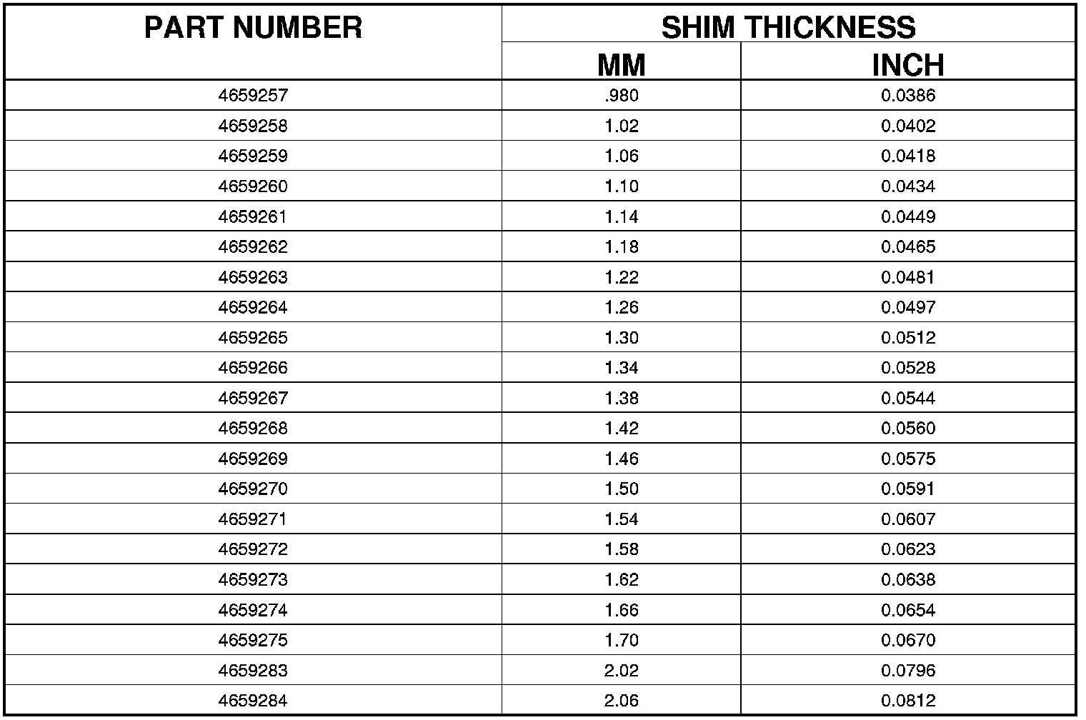 DIFFERENTIAL BEARING SHIM CHART