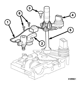 2. Install the screws (6) to hold the Pressure Control Solenoid (1) and Line Pressure Sensor (2) to the valve body.