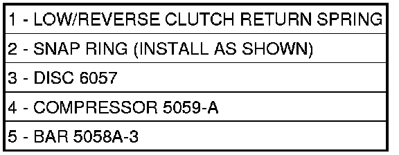 11. Install low/reverse spring compressor Disc (3), Compressor (4) and Bar (5) into position.