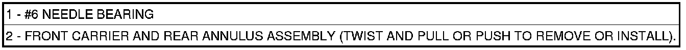 NOTE: The number seven needle (1) bearing has three anti-reversal tabs and is common with the number five position. The orientation should allow the bearing to seat flat against the rear sun gear. A small amount of petrolatum can be used to hold the bearing to the rear sun gear (2).