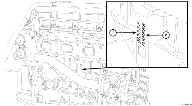 The upper main bearing shell identification (1) is located in the middle of cylinder block on the right side of the engine. There are three different size bearings available. The bearing class is read downward from top and corresponds to the front journal to the rear journal on the bottom.
