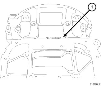 The engine serial number (1) is located on the bottom of the ladder frame just behind the oil pan. The serial number can be seen with the oil pan in place.